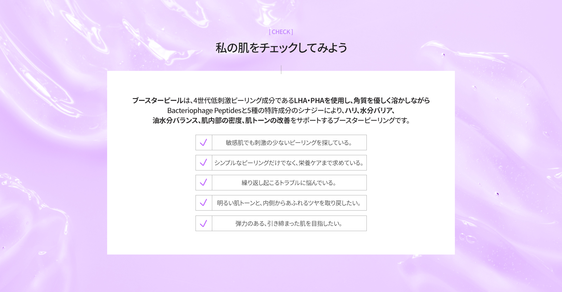 ブースターピールは、低刺激のピーリング成分で古い角質をやさしく溶かし、弾力・水分バリア・肌トーンの改善をサポートするブースターピーリング施術です。