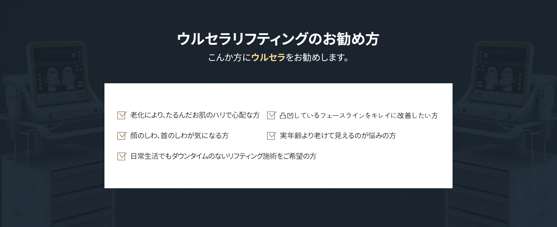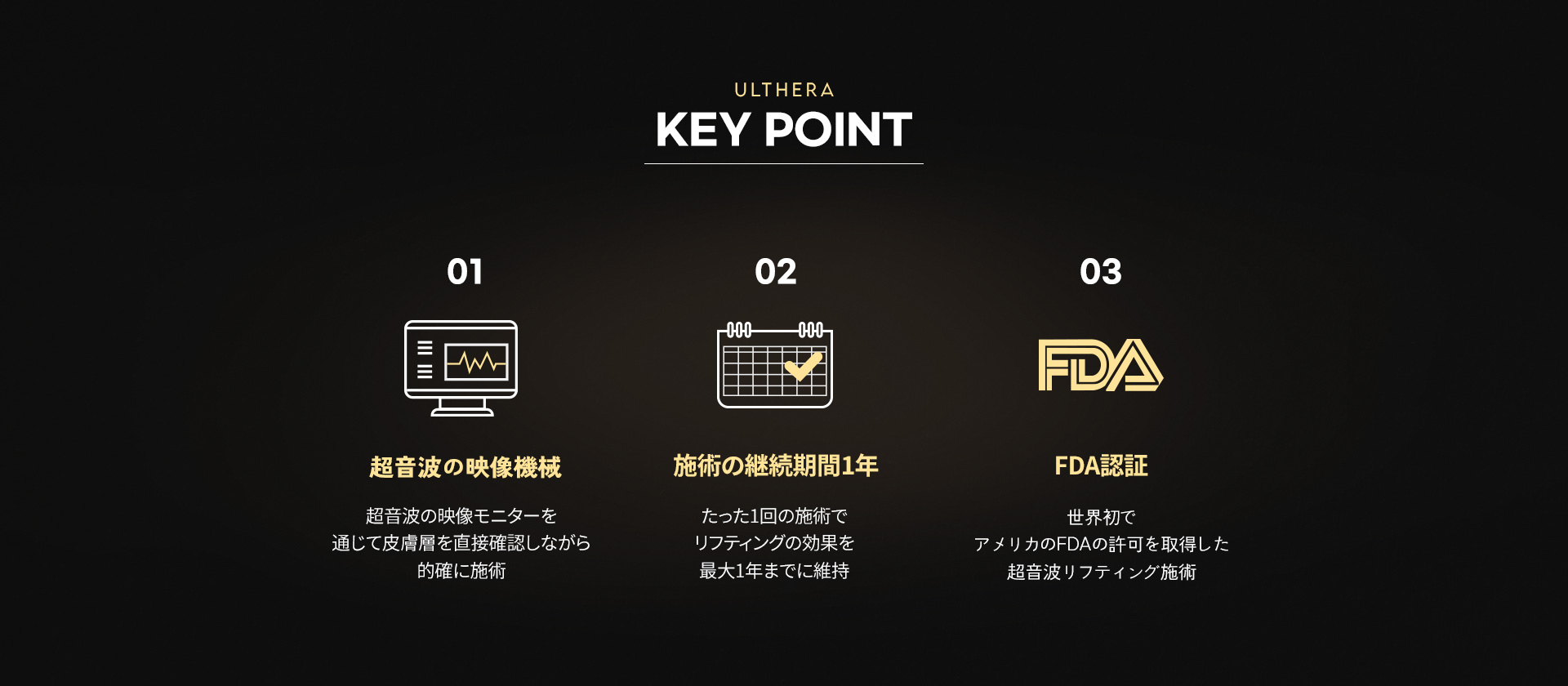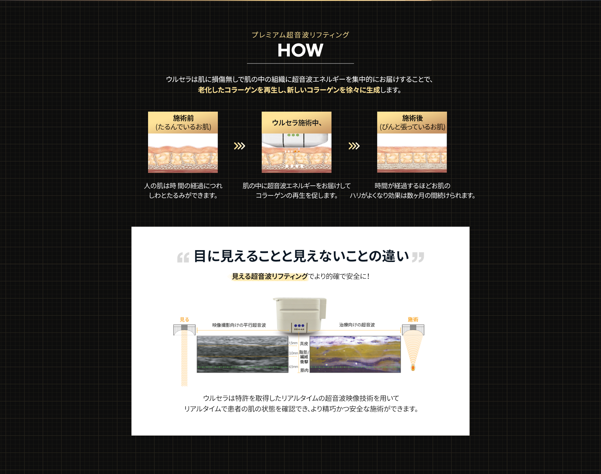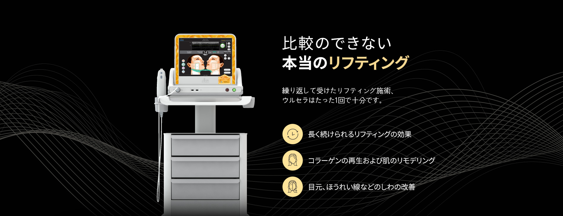 ウルセラは、超音波画像装置を用いた精密な施術が可能で、長い持続力と米国FDAの承認を誇るプレミアムリフティングです。